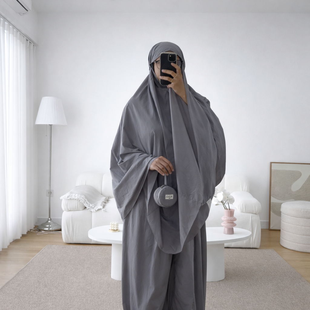 Confectionné en Indonésie, où la tenue de prière — appelée mukena — fait partie du quotidien, cet ensemble a été conçu pour être agréable à porter, facile à emporter et adapté aux usages nomades.